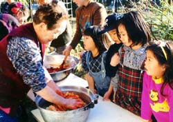 | | 本物のキムチ漬けを見守る園児ら |