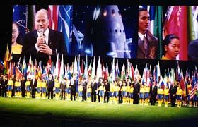 本番までちょうど3年となった5月31日、韓国と日本が共催するサッカーの2002年ワールドカップ(W杯)の公式エンブレムが、韓国組織委員会(KOWOC)、日本組織委員会(JAWOC)、国際サッカー連盟(FIFA)組織委員会から同時に発表された。また、12月1日には、マスコットの「アトモ」も発表された。