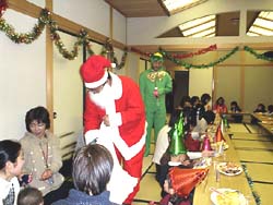 鄭支団長扮する、サンタクロースからお菓子をもらい大喜び。続いてクリスマスツリーやトナカイ、カッパ等に扮した青年会4日市支部(〓尚煕会長)を中心とした青年会による進行のもと、シャンパンで乾杯。その後、「カイバイボゲーム」をはじめ、様々なゲームを楽しんだ。