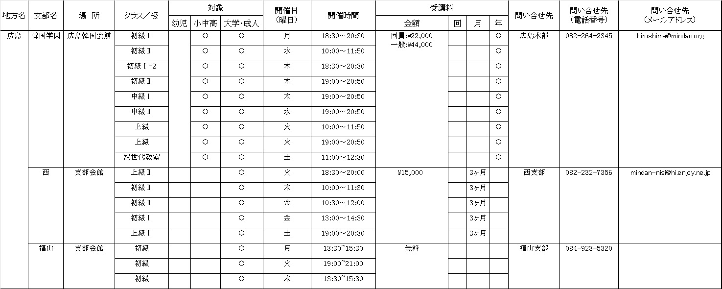 2024年度 各地の韓国語教室<中国地区>