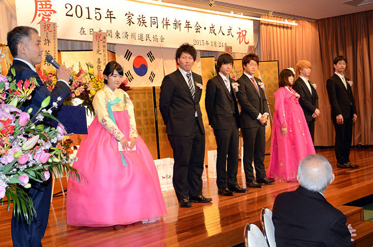 成人式も兼ねて 在日本関東済州道民協会(高隆博会長)は24日、東京・台東区の上野精養軒で成人式を兼ねての開催。家族同伴で400人余りが出席した。新成人7人には同協会のほか、元喜龍道知事、具誠祉道議会議長、李碩文教育監、許香珍済州大学総長らからそれぞれ記念品が贈られた。新成人を代表して高梨世子さんが「済州道...