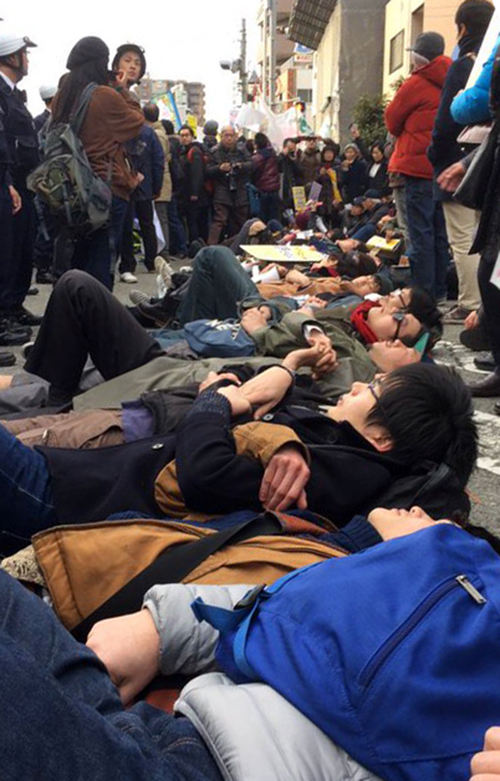 [ 路上に体を投げだしてヘイトデモ隊の侵入を防ぐ ]