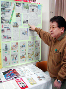 企画したのは同カレッジ「ハングル学科」で学ぶ能瀬信博さん(68)=狭山市在住=。展示物の中心には高麗聖天院での「在日韓民族無縁の霊」献歌祭の記事(9月8日付4面)を全体のヘソともいうべき場所に置いた。能瀬さんによれば、若い世代が「こんなことあったの」「エー、という目で見ていく」という。