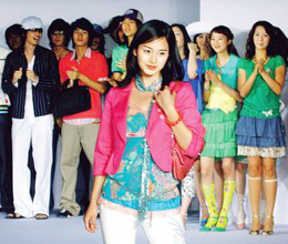 人気タレントのキム・テヒさんが、軽快な音楽にあわせて舞台に登場すると、北韓の来賓たちも拍手を送った。20人のモデルが披露した100余点の新商品のうち、半数が開城工場で生産された。