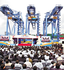 東北アジアの港湾物流の拠点となる釜山新港の一部が19日、開場した。コンテナターミナルで行われた開港式には、盧武鉉大統領ら約2000人が出席した。