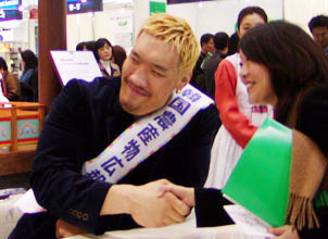 「韓国食品をよろしく」。K‐1のチェ・ホンマンさんが15日、千葉の幕張メッセで開かれたフーデックスジャパン(第31回国際食品・飲料展)で韓国農産物広報使節を務め、サイン会を行った。リング上のこわい雰囲気とは打って変わり、ファンとの記念撮影に愛嬌のある顔でニッコリ。韓国ブースでは、計309件、8億2700万㌦の契約が成立。