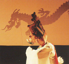 作品の特徴は、平面の影絵人形だけではなく、立体の人形も使用。またスクリーン前に踊り手が出て舞うのは、ほかの国の影絵では見られない。