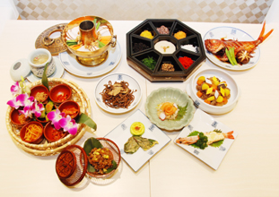 [ 宮廷料理では欠かせない九節板をはじめカルビチム、豆腐チョンゴル、手作りキムチの数々などが並ぶ宮廷料理の一部 ]