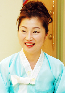 [ オーナーの李英淑さん。コースではチマ・チョゴリ姿で接待もしている ]