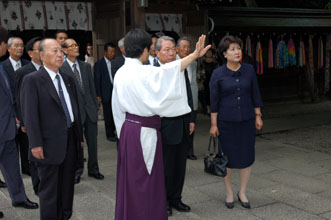 [ 高麗文康宮司から説明を受ける柳大使夫妻(右) ]