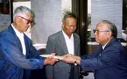被災者支援のために同会会員27人で募った誠金を、民団中央本部の具文浩副団長に手渡した。