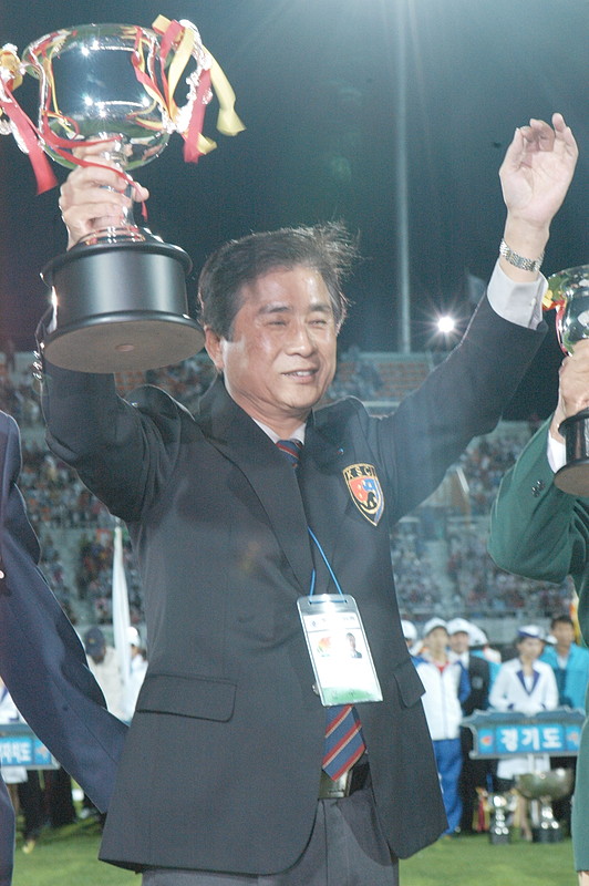 | 優勝カップを高々と掲げる南照男在日同胞選手団長 |