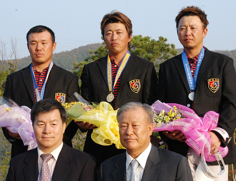 | ゴルフでは金・銀・銅を独占する大活躍(左から銅メダルの金吾策、金メダルの孫永基、銀メダルの金浩延) |