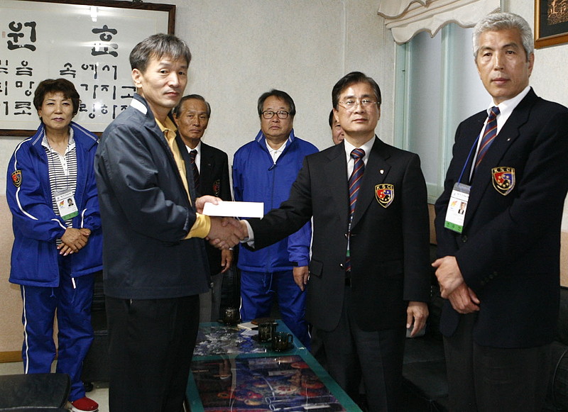 ポケットマネー役員が寄せ合い在日同胞選手団の南照男団長と朴安淳会長ら在日同胞選手団役員は10月22日、慶尚北道亀尾市の養護施設「サムソン院」を慰問し、激励金300万ウォンを託した。亀尾市は今国体で在日同胞選手団のメーン宿舎でもあり、地元市民やボランティアから多くの支援を得た。 この支援に対し、「同地域青少年育成のために何か役立てて」と選手団役員一人ひとりがポケットマネーから「カンパ」。恵まれない子どもたちのためにと寄せあった。 |
