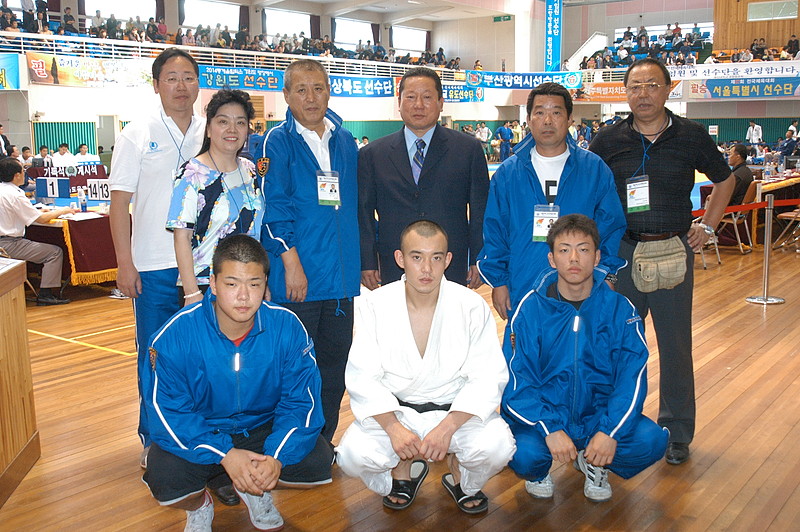 | 期間中、金泰珍総監督(後列右から2人目)は各競技団体代表を訪れ、在日同胞選手の活躍の場拡大を要請した(写真は柔道会場で) |