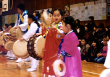 午前のオリニ文化発表でのプンムルノリでは、保育所に通うオリニから中学3年生まで36人のオリニたちがチャンゴ、ケンガリなどの音色とともに同小学校体育館内を練り歩き、特に幼児たちのかわいいチマ・チョゴリ姿に観客は目を細めていた。また体育館の壁には、写真やコメントを交えて今までの取り組みが説明されており、他校の先生たちも熱心に見入っていた。昼食休憩では、各小学校の保護者たちが一緒になって作った韓国料理・400食が振舞われた。