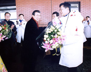[ 選手団長に花束を渡す青森本部の李斗浩団長 ]