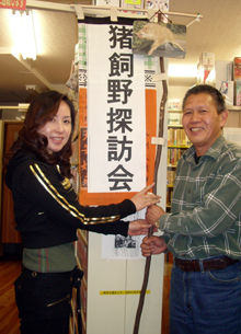 [ 「猪飼野探訪会」を支える地元の郷土史家と旗を持つ探訪会の代表、姜信英さん(左) ]