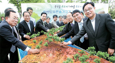 [ 6日に開かれた「韓半島青い森育成国民運動宣言式」で韓半島の模型に「苗木」を植える参席者 ]