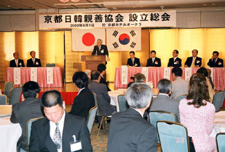 【京都】京都日韓親善協会は1日、市内のホテルで「設立総会」を開き、活動を再開した。地元行政から山田啓二府知事、門川大作市長らがお祝いに駆けつけるなど、韓日双方から関係者250人余りが出席した。