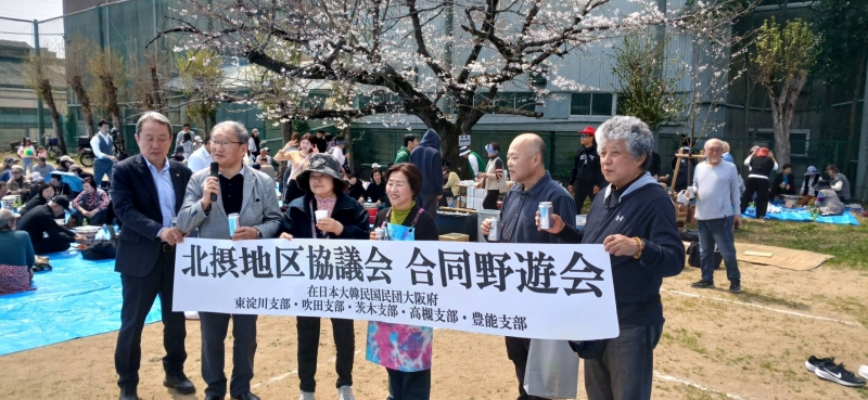 【大阪】大阪の北摂地区協議会(東淀川、豊能、吹田、茨木、高槻の5支部)の合同野遊会が3月29日、吹田市内のグランドで開催され、昨年を上回る250人の同胞が参加、満開の桜の下で大いに交友を温めた。