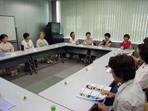 [ 王秀英さん(左から2番目)の話を聞く会員 ]