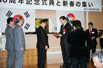 同会はこの30年間、美術館や老人ホーム建設、植樹事業、スポーツ振興支援、水害義捐金の送金といった様々な形で郷土の発展に貢献してきた。席上、金斗官道知事はあらためて感謝の言葉を述べ、会を代表して沈基洙会長と李三赫常任副会長、王寛一監査にそれぞれ感謝状と記念品を手渡した。