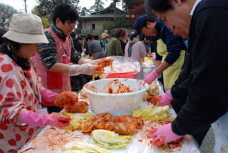 【埼玉】高麗神社境内(日高市)で11月27日、地元の主婦ら170人が一斉にキムチづくりに励んだ。同神社が実施している高麗郡建都1300年記念事業「高麗郷文化フェスティバル」の一環。