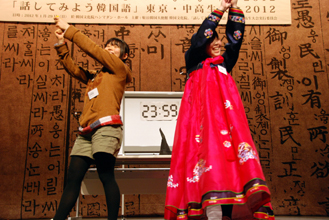 今大会には関東地区の1都4県35校から100人以上の応募があった。2人ペアとなって決められた台本をもとに発音や表現力を競う「スキット部門」にはテープ審査を突破した28組、与えられた5枚の課題写真の中から1枚を選んでその写真にマッチした韓国語のメッセージを創作して発表する「フォトメッセージ」部門には11人が出場した。