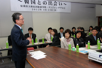 【神奈川】駐横浜総領事館の李壽尊総領事は23日、横浜市役所の職員を中心とする韓日友好サークル「テンジャンチゲの会」(落合明正代表)を同総領事館に招待し、「韓国との出会い」と題して第1回の交流会を開いた。会員とその家族、友人など33人が参加した。