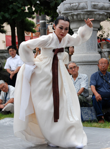 本堂での供養の後、境内で韓国伝統舞踊家の金順子さんが鎮魂の「サルプリ」を舞った。この後、藤岡公民館に移り、「学習と交流の集い」をもった。