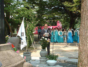 [ 慰霊碑を前に追悼辞を読む朴昭勝民団広島県本部団長 ]