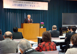 「人生も経営もグー・チョキ・パー」をテーマに金子氏は、「人の気持ちをつかみ(グー)、欲を捨て(チョキ)、自分をさらけ出す(パー)ことが大事。明るく、根気強く生きよう」と強調した。