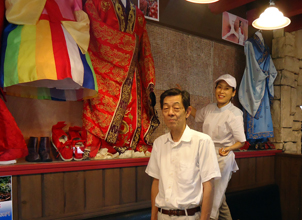 店内には韓国のテレビドラマ「朱蒙」(MBC製作の史劇ファンタジー)で、主人公のチュモンが身につけた甲冑や王冠、チュモンとソソノが結婚式を挙げたときのきらびやかな衣装、豪華な螺鈿タンスなどがずらり。いずれもドラマで実際に使われたものばかり。センター長の尹さんが、MBCから特別に譲り受けた。