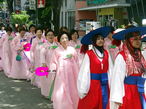 参加団体はおそろいのチョゴリを身につけた婦人会兵庫本部(李慶子会長)、韓国伝統芸術団、姫路獨協大学の学生ら60人。韓服姿のオリニを先頭に勇壮なサムルノリのリズムにあわせ、新開地本通から湊川公園までの1・5㌔を練り歩いた。沿道からは「チョゴリがきれい」、「とっても可愛い」と声があがった。