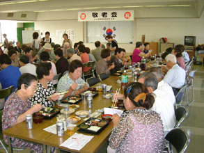75歳以上のハラボジ、ハルモニ98人と関係者らあわせて200余人が長寿を祝った。朴会長は「末永い健康を」と呼びかけた。参加者のうち、最高齢者は89歳の朴泰鳳ハルモニと李順道ハルモニの2人で、米寿を迎えたお年寄りと一緒に花束を受け取った。民謡のリズムに大勢が踊り出すなど、にぎやかな会に婦人会関係者も大喜びだった。