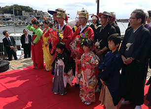 鞆の浦は朝鮮通信使の正使・趙泰億(チョテオク)が「日東第一」と絶賛した景勝地。県内外から多くの観光客が集まる中、色鮮やかな民族衣装をまとった一行が埠頭に降り立ち、歓迎式典が行われた。