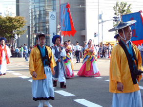 同まつりへの参加は20回目。例年の支部団員や建国中・高等学校の生徒らによる朝鮮通信使行列のほか、今年は姜輝鮮朝鮮舞踊団や建国小学校プンムル隊など、総勢150人が参加した。