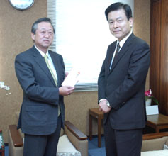 在日大韓基督教東京教会(金君植牧師)の金一範、李秀夫両長老が15日、民団中央本部を訪れ「脱北者支援センター」の呂健二代表に10万円の支援金を手渡した。