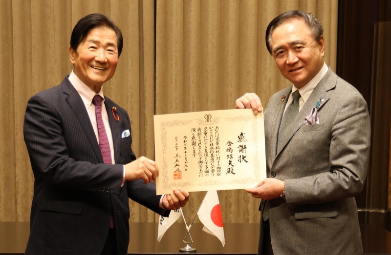 【神奈川】神奈川県の黒岩祐治知事は昨年12月19日、社会的養護が必要な児童らにと、同7月22日に1000万円を寄付した在日2世の金昭夫みんだん生活センター所長(金嶋昭夫・金嶋観光グループ代表取締役会長)に神奈川県庁で感謝状を手渡した。