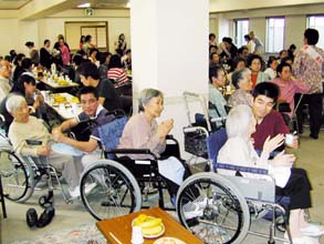 [ 観音ボランティア会主催の敬老会で手拍子をとるお年寄り ]
