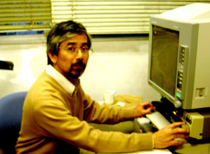[ 解放前(戦前)の新聞のマイクロフィルムを調べる京都大学の水野直樹教授 ]