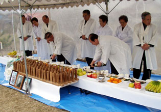 主催した『長生炭鉱の〞水非常〟を歴史に刻む会』の山口武信会長は、「会設立14年目を迎えてなお追悼碑建立が実現できず、大変申し訳ない。遺族や支援者も高齢化が進み、昨年亡くなった方もいるが、実現まであきらめずに運動を続ける」と決意を新たにした。続いて、金亨洙遺族会会長の弔辞や遺族によるチェサがあり、ピーヤの見える海に献花した。