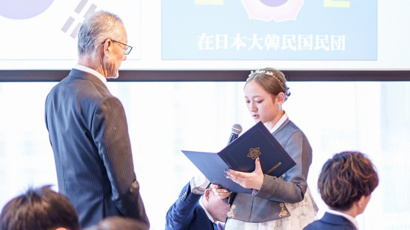 新成人代表の成侑史さん、鄭杏月さんに金団長から記念品が贈られ、新成人を代表して、洪錫一さん(学生会同本部会長)が「成人を迎えることができたのは、在日1世や2世の先輩方の苦労と努力があったから。その歴史と想いを胸に、私たちはこれからの人生を歩んでいく。在日韓国人としての誇りを胸に、韓国と日本の架け橋となり、世界に羽ばたく人材をめざす」と力強く答辞を述べた。