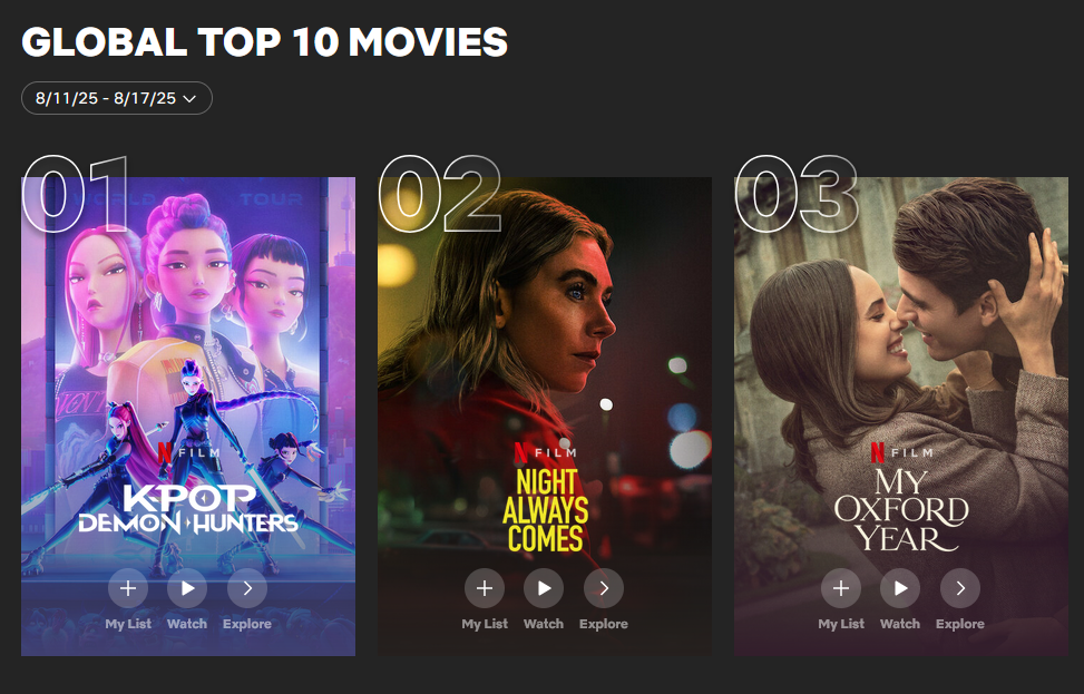 ネットフリックスのアニメーション映画「KPOPガールズ!デーモン・ハンターズ」が、映画部門で視聴数1位を奪還した。