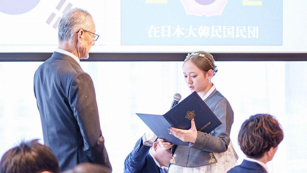 家族が見守る中、新成人代表の朴さらさんが、家族や友人らへの感謝の意を述べ「自分らしい価値を見つけ、未来を切り拓いていけると信じている。韓半島にルーツをもつ民族の一員として、自国への愛を胸に祖国と日本の架け橋となり、新しい未来を築いていく」と決意を新たに述べた。