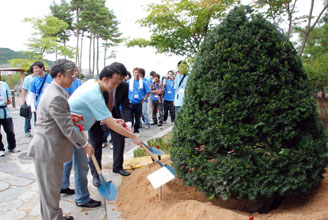 都羅山駅で600人の参加者全員が平和統一を願いながら、高さ2メートルほどの朱木(イチイ)を植樹した