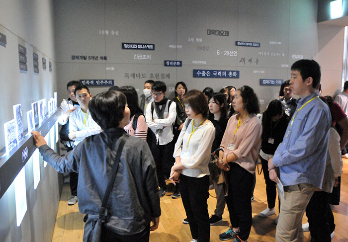 肌で知る南北分断の緊張  | 真剣に 30班に分かれて「在日」をテーマに行われたグループディスカッションでは、就職、恋愛・結婚、民族名使用など将来の生き方について語り合った |  | 盛り上がる 最後の夜、江南のクラブで行われたフェアウェルパーティーでステージに上がって「江南スタイル」を踊る青年たち |  | 歓声 人気ボーイズグループ「MAD TOWN」によるライブも行われ、女性たちも大喜び |  | 知る 大韓民国歴史博物館では展示された植民地時代から現代までに至る韓国の姿を学んだ |  | ストリート ソウル市内フィールドワークの仁寺洞では朝鮮朝時代やフュージョン韓服を試着してストリートを闊歩 |  | 最前線 DMZの近くある都羅展望台では南北分断の現状を自分の目で確かめた |  | 南侵トンネル 北韓が掘った第3南侵トンネルの説明を受けると青年たちの表情も真剣に |  | またいつか 本国大学生との交流プログラム後、SNSを交換しながら別れを惜しむ | (2016.9.28 民団新聞) |