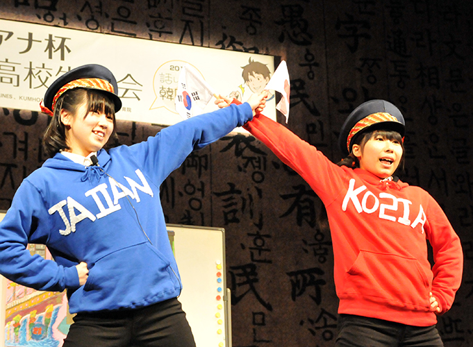 韓国語を学ぶか、学びたいと考えている高校生にとっては「甲子園」ともいうべき晴れの発表舞台、第8回クムホ・アシアナ杯「話してみよう韓国語」高校生大会(クムホ・アシアナ財団、韓国文化院ほか主催)が8日、東京・新宿の韓国文化院で開かれた。 今年は全国から461人が応募。このなかから32人が地区予選を勝ち抜き、2人1組で寸劇を演じるスキット部門、スピーチ部門、日本語エッセイ各部門にわかれて最優秀賞をめざした。 審査の結果、スキット部門の頂点に立ったのは土屋芽生さんと岡崎健さんの男女ペア(共に東京学芸大学付属国際中等教育学校5年生)。副賞は1週間の韓国ツアーと慶熙大学校国際教育院での語学研修。土屋さんは「今後も熱心に勉強して、韓国の友だちをたくさんつくりたい」と喜びを表した。 このほか、スピーチ部門は清水望未さん(神奈川県立横浜国際高等学校3年、「温かい心」)。日本語エッセイ部門は大森凜香さん(松山東雲中学高等学校・愛媛2年、「大好きな韓国とダンス」)がそれぞれ選ばれた。 大会実行委員長を務めたアシアナ航空日本地域の柳光烈本部長はすべての参加者に向けて、「これからの韓日関係を牽引していく存在になってください」と期待の言葉を述べた。 ■□ 高校生大会兵庫県でも…神戸韓国教育院 【兵庫】兵庫県内の高校で韓国語を学ぶ高校生によるスピーチ大会がこのほど、神戸市長田区の兵庫韓国文化教育院で行われた。神戸韓国教育院(鄭基澤院長)が主催。11校から15人が参加した。 審査の結果、韓国のファッションを日本に向けてどんどん紹介できるバイヤーになるという将来の夢について発表した生島あずささん(兵庫県立伊川谷高校2年)が「大賞」を受賞した。タイトルは「素敵な将来の夢、待ってね! 私が行く!」。副賞として韓国往復航空券が贈られた。 このほか、李暎純さん(仁川学院高校1年)に「金賞」、李允智さん(芦屋学園高校2年)と納朱里さん(兵庫県立神戸甲北高校3年)の2人には「銀賞」が贈られた。 会場には発表者の家族、友人ら150人が詰めかけた。 (2015.3.18 民団新聞) |