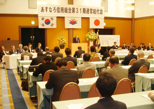 姜栄文理事長は「地域密着型の経営強化を図りながら新商品の懸賞金付定期預金・積金を取り扱い、目標を高く掲げるなど積極的な営業を進めてきた。その結果、業務利益は5億2100万円を計上することができた。しかし、不良債権処理にともなう貸倒引当金の増加で9400万円の赤字を余儀なくされたが、配当は昨年と同じように実施することができた」と説明した。